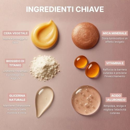 – Biossido di Titanio: contribuisce alla protezione solare naturale e dona uniformità al tono della pelle.