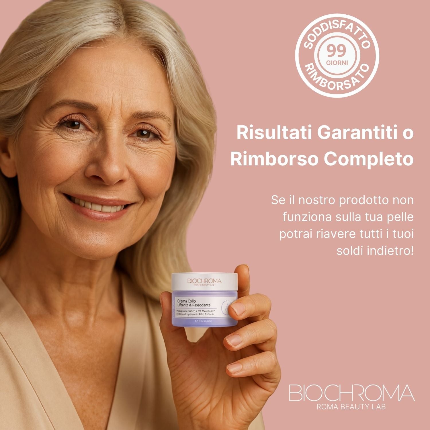 Sappiamo che scegliere un nuovo prodotto per la skincare richiede fiducia. Per questo vogliamo che tu possa provare la Crema Collo di BioChroma senza alcun rischio.