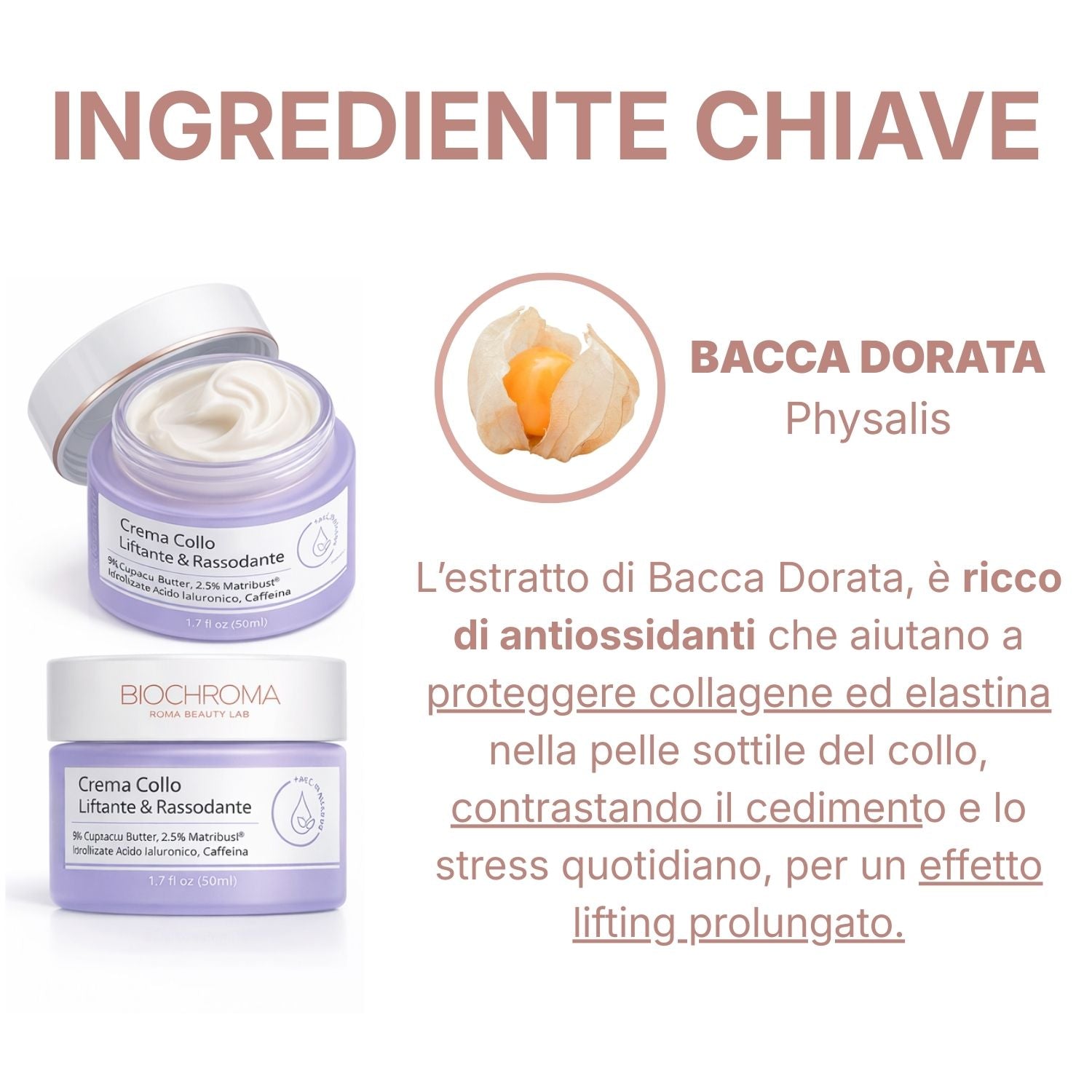 Bacca Dorata (Physalis) – Potente antiossidante naturale che protegge collagene ed elastina, contrastando il rilassamento cutaneo e preservando l'elasticità della pelle.
