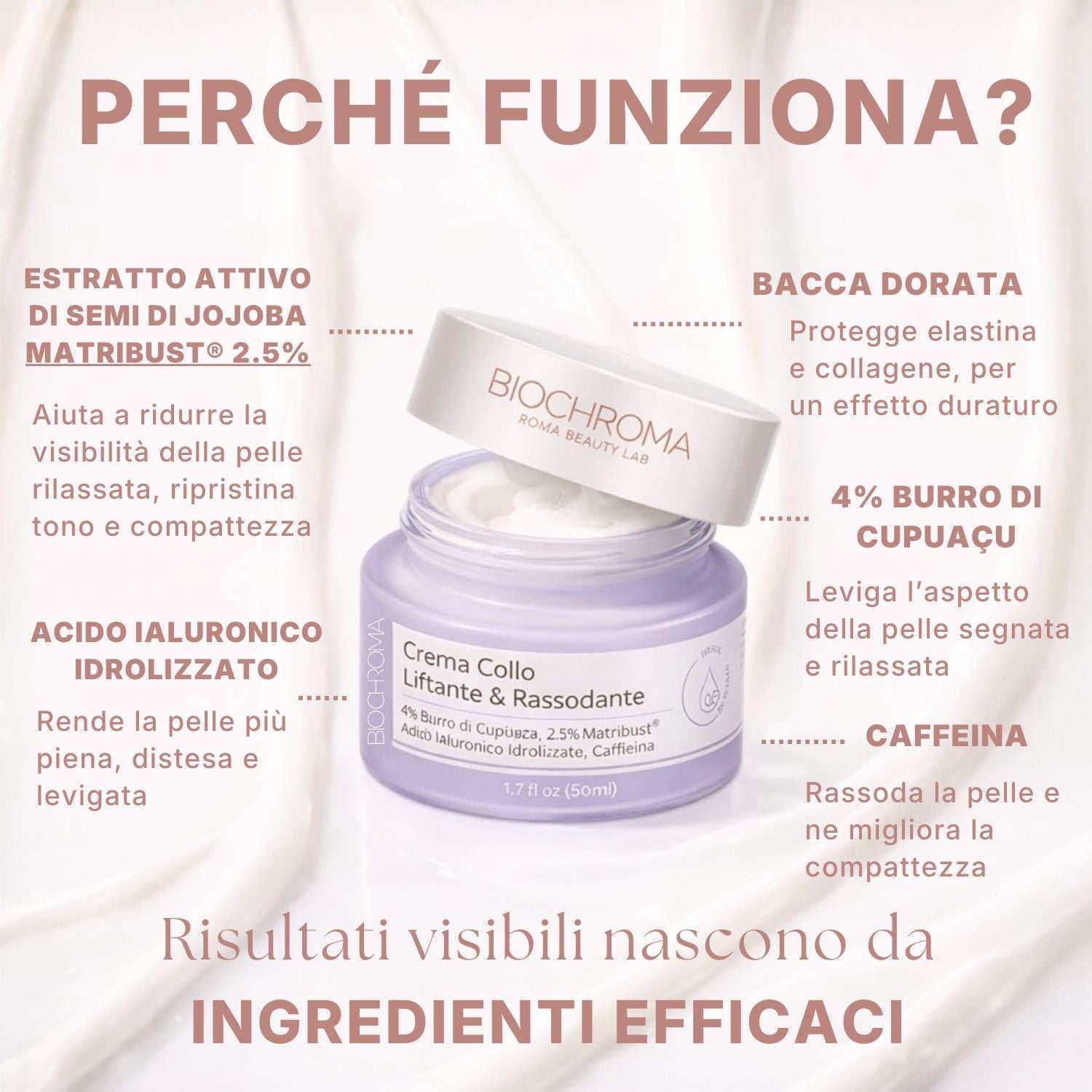 Il collo è una delle prime zone a tradire l'età: la pelle perde tono, compaiono rughe orizzontali, il profilo si rilassa e l'aspetto generale appare meno definito. La Crema Collo di BioChroma è stata formulata per agire esattamente su questi segnali, con una tecnologia studiata per rassodare, levigare e ridefinire.