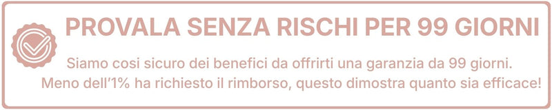 La nostra promessa è semplice: se dopo 99 giorni di utilizzo costante non sei completamente soddisfatta dei risultati, ti rimborsiamo l'intero importo. Nessuna domanda, nessuna complicazione.