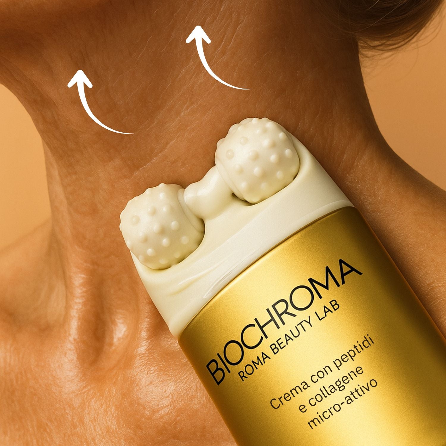La crema collo BioChroma utilizza il BioChroma Adaptive Complex™, un sistema avanzato di peptidi bioattivi e collagene micro-incapsulato che lavora in sinergia con il roller massaggiante integrato.